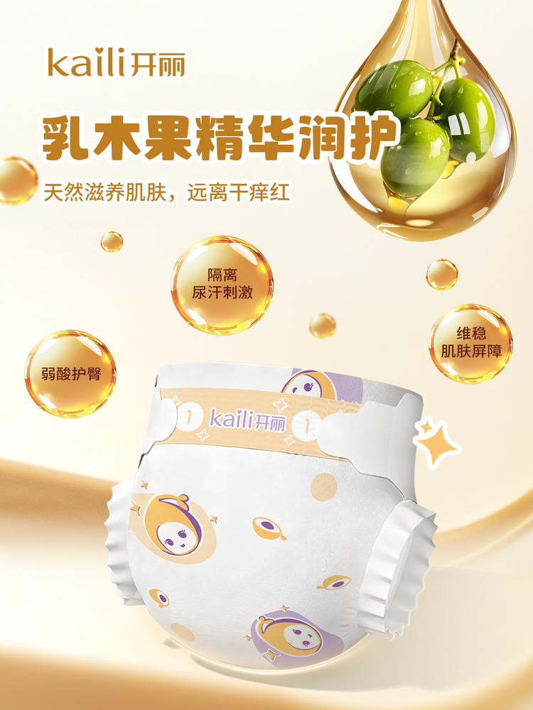 洞察新生代父母对“护肤级护理”的迫切需求,开丽创新将乳木果精华融入产品面层,被誉为“肌肤软黄金”的天然滋养成分,能在宝宝臀部形成温和保护膜,长效缓冲尿液与粪便刺激,温柔守护新生儿娇嫩肌肤。